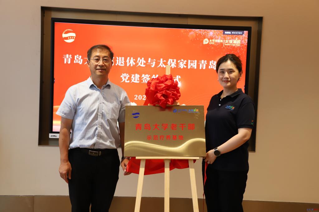 宋佐东与苏晗一同为“青岛大学老干部示范疗养基地”揭牌,开启青岛大学与太保家园青岛社区校企合作的新篇章。