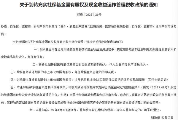 开云官方9月2日,财政部、税务总局联合发布重磅通知,明确四项税收优惠政策,旨在支持划转充实社保基...