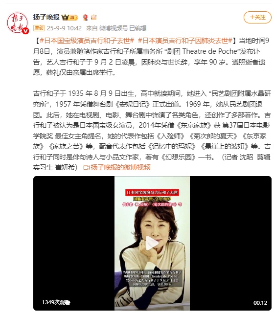 开云官方当地时间9月8日,演员兼随笔作家吉行和子所属事务所 “剧团 Theatre de Poc...