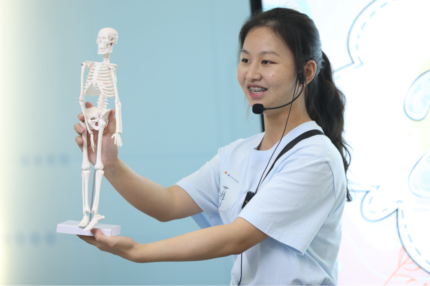 在科学展区,一副可拆解骨骼模型成为“明星教具”。团队成员王晓菲轻轻转动模型的肩关节,向孩子们演示:“就像积木搭城堡,我们的206块骨头互相连接,才能跑能跳。”活动现场,通过骨骼模型展示,队员们深入浅出地介绍骨骼支撑的原理,还组织孩子们在实践中认识骨架结构。团队以寓教于乐的方式,带领孩子们探索微观世界,激发他们对生命科学的兴趣,为科学启蒙播下种子。